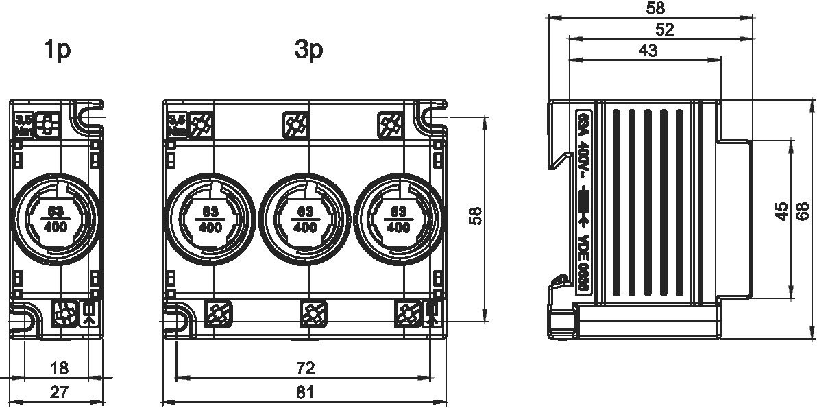 Omschrijving | Zekeringhouder D02 of D01, 63A, 400 V, 3p, 81mm |